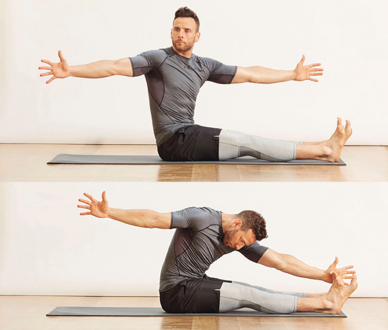 Sit on floor, legs extended, heels wider than hips, arms extended to sides, and palms facing forward, to start. Inhale and rotate torso clockwise, then exhale, fold forward, and reach left palm to left foot. Inhale and reverse rotation, then exhale and return to start. Repeat on right side for 1 rep.