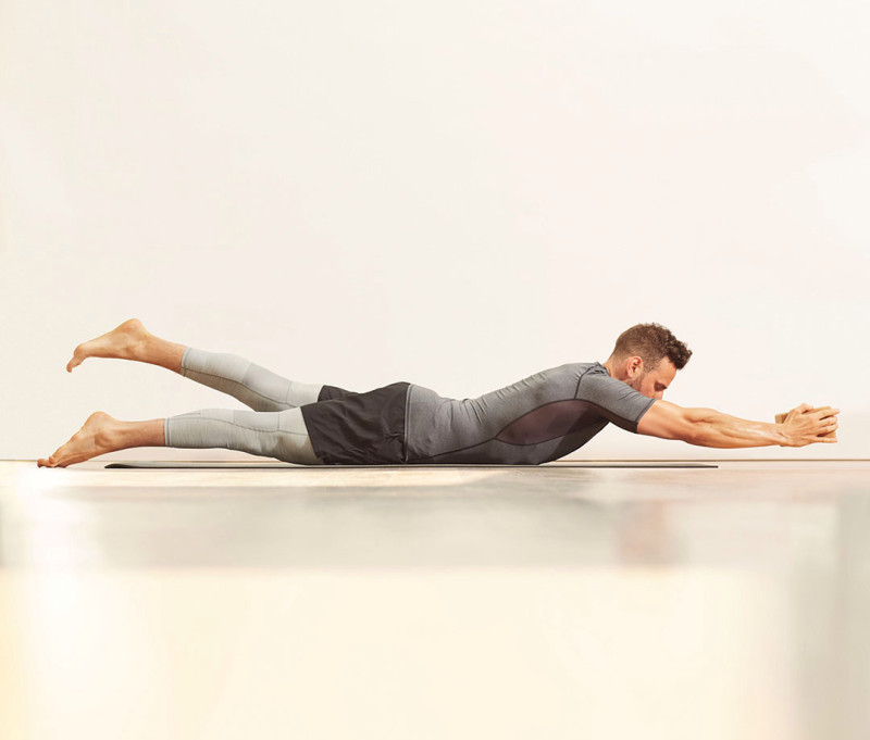 Lie on stomach, with legs, torso, and arms farming a straight line, holding a yoga block horizontally. Inhale, then exhale and lift chest, arms, and legs off floor to start. Inhale while lifting and lowering legs, like a swimmer’s kick, for 5 pulses. Exhale and repeat sequence—20 pulses total—for 1 rep. Inhale, then exhale and lower entire body to the mat.