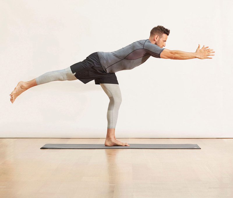 Stand, feet hip-width apart, to start. Shift weight left, inhale, lift right knee to chest, elbows down at sides, palms facing up near chest. Exhale, soften left knee, hinge forward, and extend arms, and right leg back. Reverse to start, then repeat on right side for 1 rep.