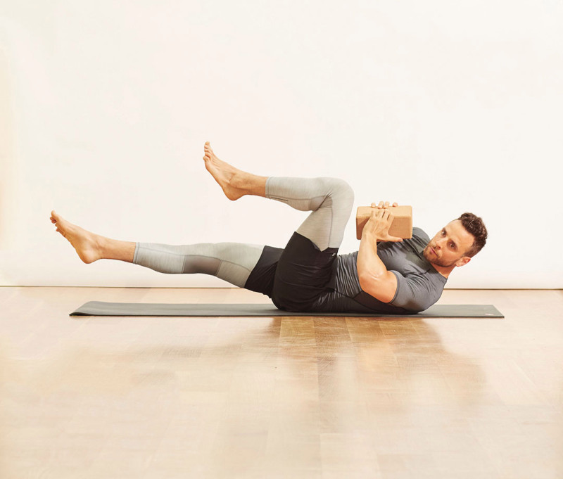 Lie on floor with legs raised, knees bent 90 degrees, shins parallel to the floor. Hold a yoga block at your chest with both hands, elbows flared, to start. Inhale, then exhale and extend right leg while you lift right shoulder and rotate toward left knee. Inhale to return to starting position, then repeat on right side for 1 rep.